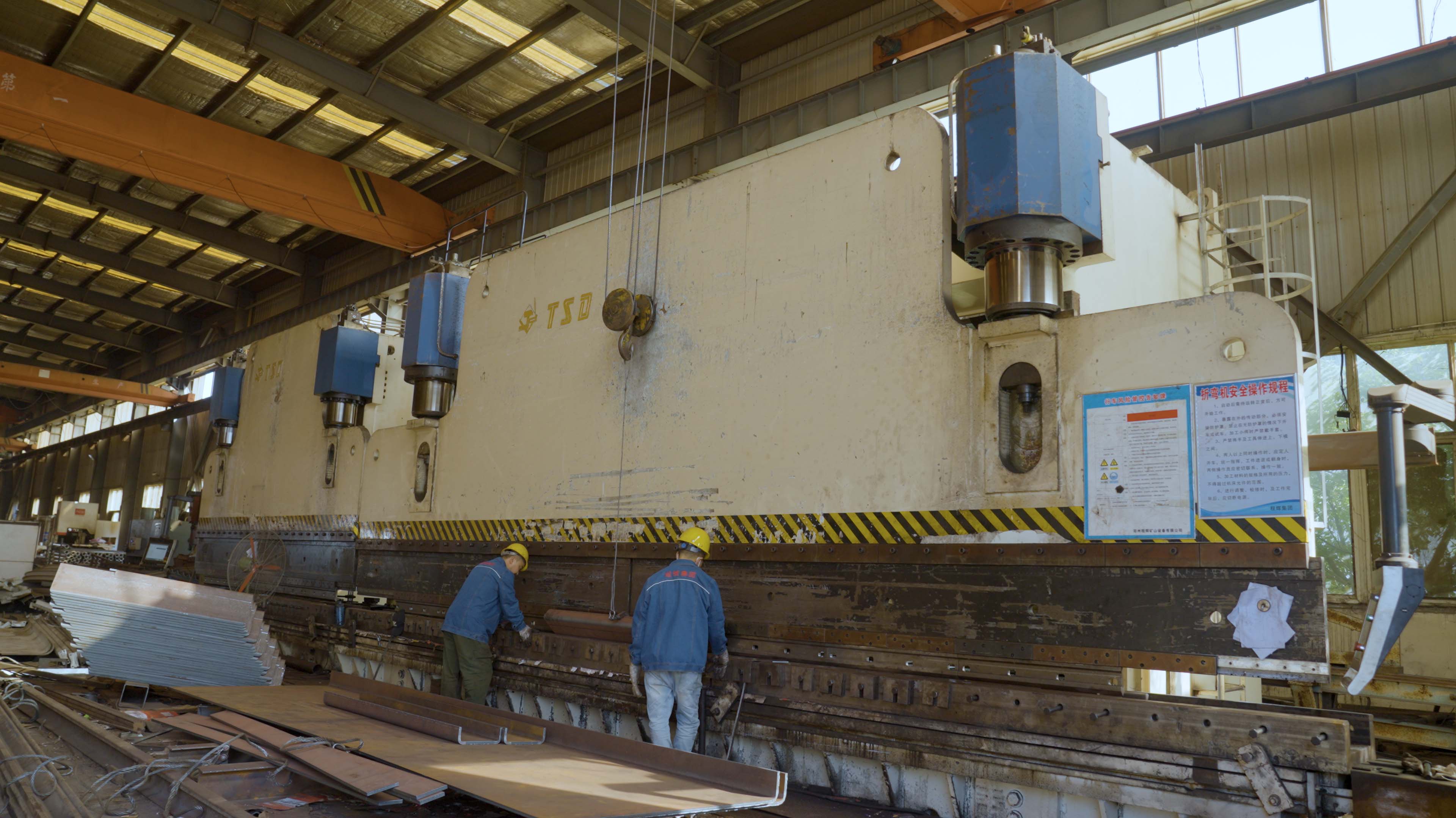 該壓彎機一次可壓13米長的鋼板成型;